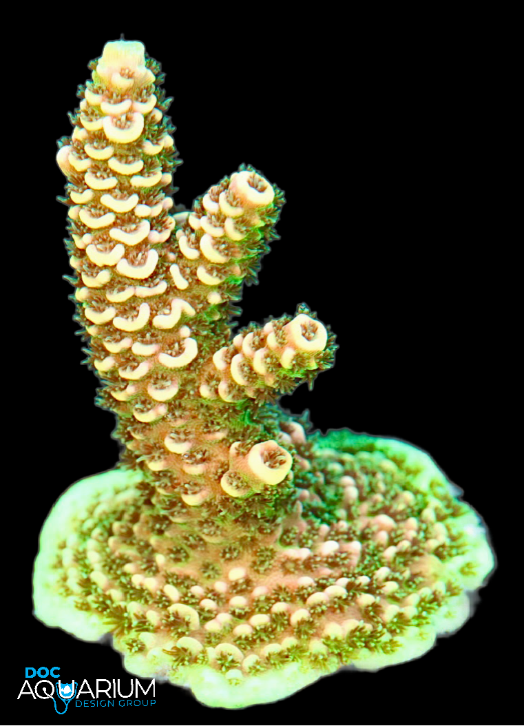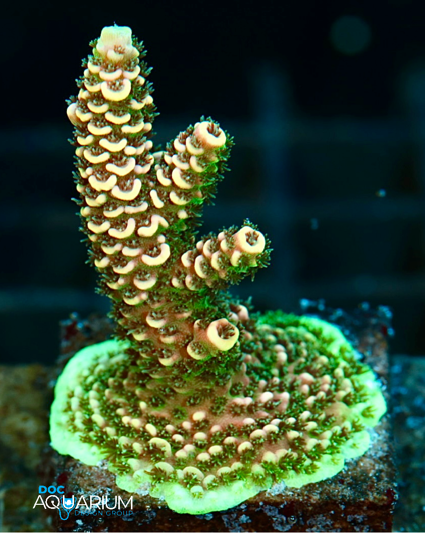 Acropora corals are one of the more challenging corals due to the fact chemistry levels need to be stable in order for this coral to do well. Regular testing of alkalinity and calcium are recommended. Flow needs to be alternating and strong. The colors will look great with good lighting, flow and certain nutrient levels. We like to install these corals high on the reef crest in all Doc’s coral reef aquarium installations.