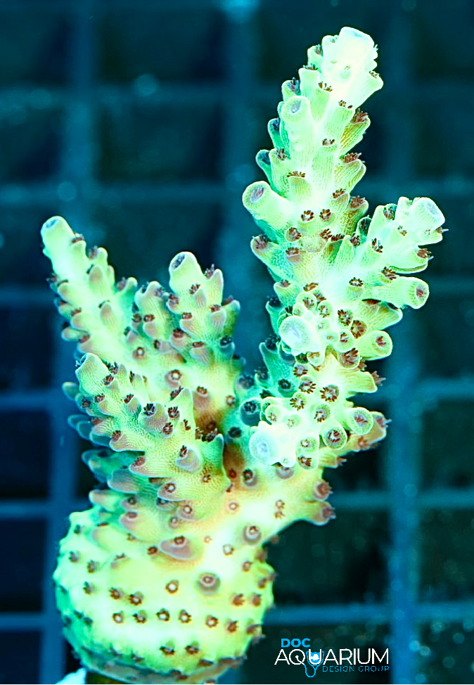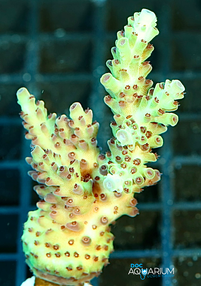 Acropora corals are one of the more challenging corals due to the fact chemistry levels need to be stable in order for this coral to do well. Regular testing of alkalinity and calcium are recommended. Flow needs to be alternating and strong. The colors will look great with good lighting, flow and certain nutrient levels. We like to install these corals high on the reef crest in all Doc’s coral reef aquarium installations.