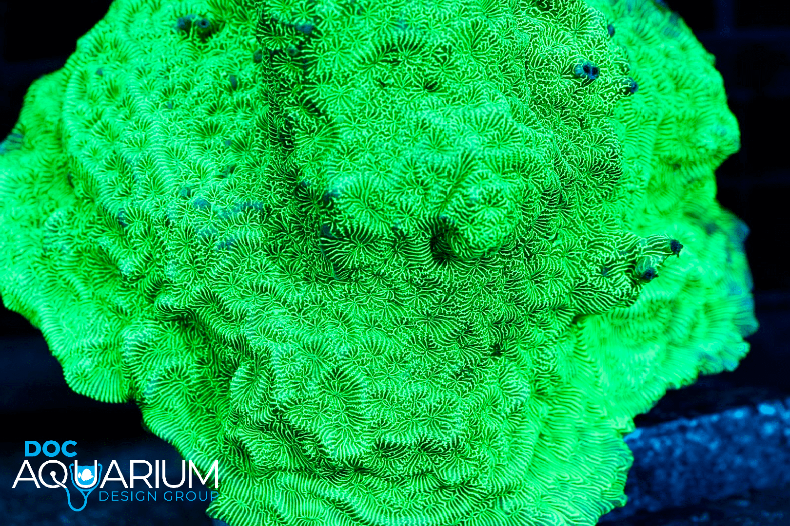 This coral has a ultra neon green color that encrusts over the rock. We acquired this coral at Reefapalooza in the OC fairgrounds around 2010. I recommend combining the Jack O’ lantern and hulk together and let them scroll around each other. This is a technique we practice in many of our custom aquarium designs and aquarium services.