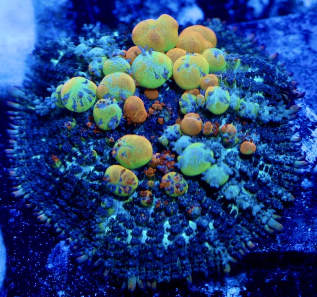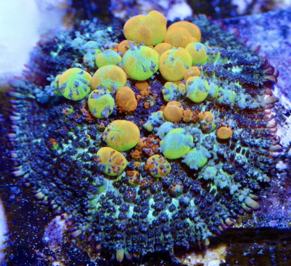 Mushroom anemones are corallimorpharians and known as the transition of stony coral to soft coral. Most mushroom corallimorpharians asexually reproduce and can multiply well. These little gems can do very well and some have extraordinary colors. The rhodactis species have a little textured like surface where small tentacles protrude from the disk. Some variations of the rhodactis can produce bubbles better known as bounce mushrooms. Discosoma species have smooth disks. The ricordea species have small tentacles spread out over the disk resembling mini carpet anemones. Ricordea can have multiple colors and different patterns making them some of the more interesting of this genus. There are two different types of ricordea mushrooms. The ricordea Yuma comes for the south Pacific region and the ricordea Florida come from the Caribbean region.