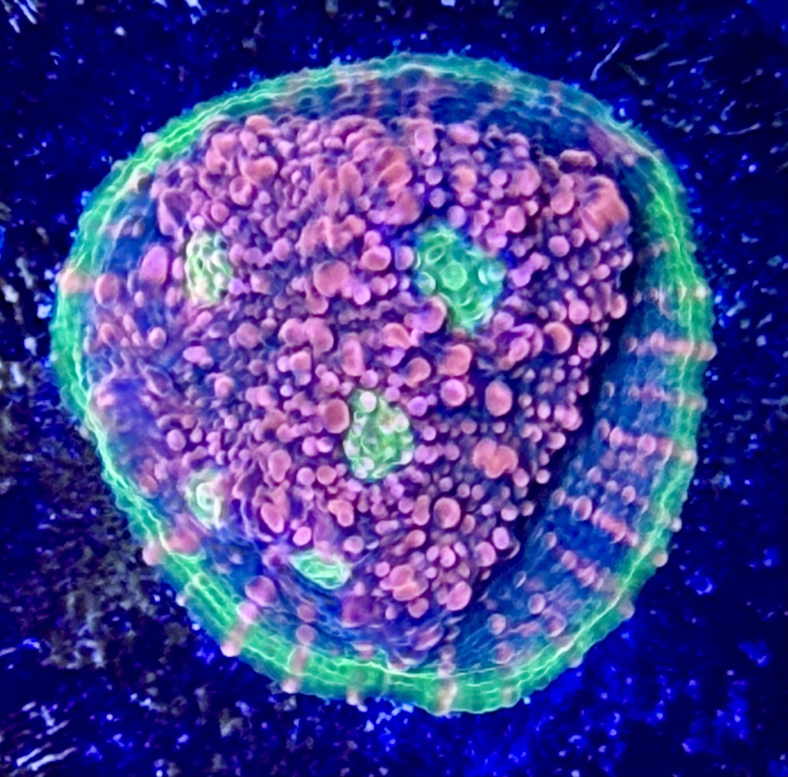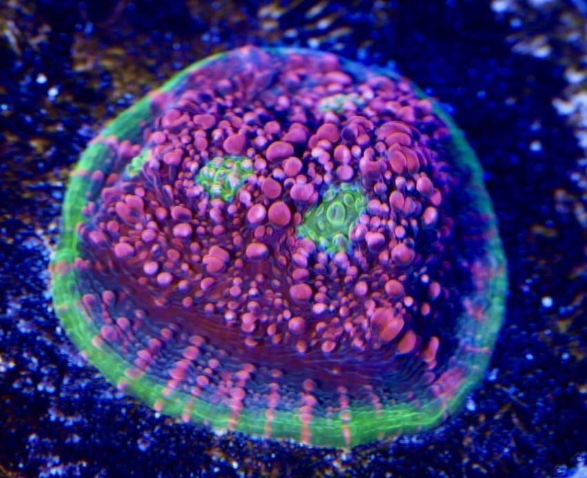 The all time classic Rainbow Watermelon chalice has a watermelon color base with deep purple lines throughout, yellow and orange corallites and a green growth margin around the edge. We have had this coral in the farm since about 2014 and it is a favorite part of the collection. We are sure to place this one out in front of all our custom coral reef aquarium build and aquarium services accounts.